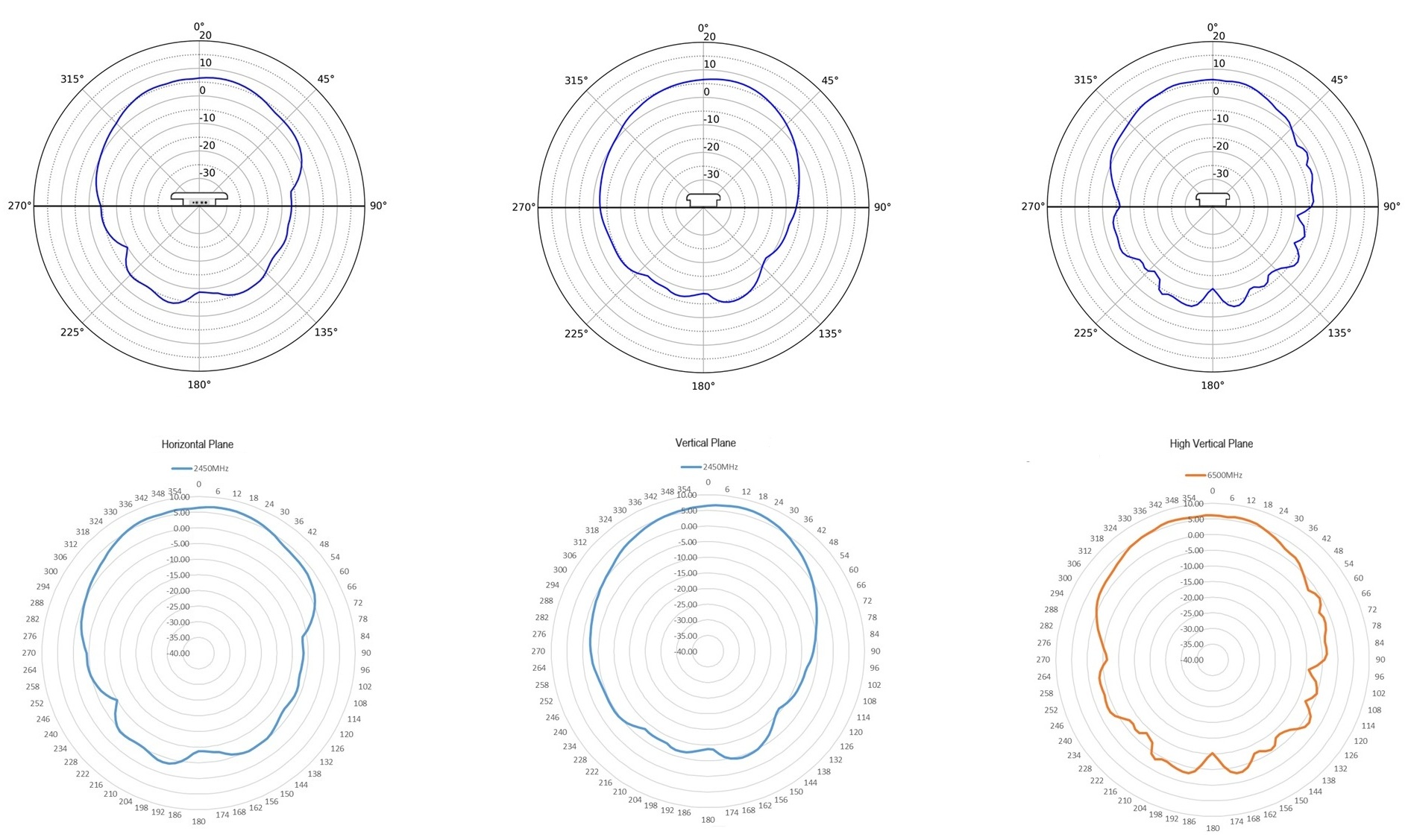 2.4 GHz Horizontal, Vertical, and High Vertical Radiation Patterns