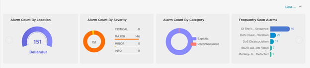 Alarm Count By Category - The types of alarm categories for the active alarms in Extreme AirDefense Essentials. The widget also includes the total number of alarms for each category.
