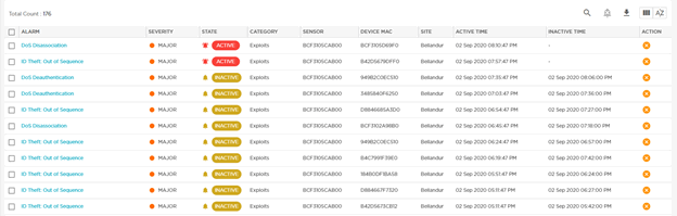 The Live Alarms Raised table displays details about the active and inactive alarms raised. For definitions of alarm status, see Alarms Cycle.