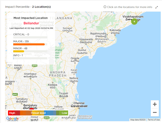 Select a location in the map to display details about the alarms at the site, including the threat score and percentile, the total number of alarms, and a break-down of the alarms by alarm severity: Critical, Major, Minor, and Info.