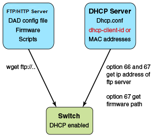 When the device starts the DHCP process, it sends the DHCP client ID to the DHCP server to get the IP address and options 66/67. The device then downloads the ZTP configuration file from the FTP server. To set up a different ZTP configuration file for different devices, the DHCP Client ID can be used in the dhcpd.conf file. Whenever dhcpd.conf is changed, the dhcpd server must be restarted.