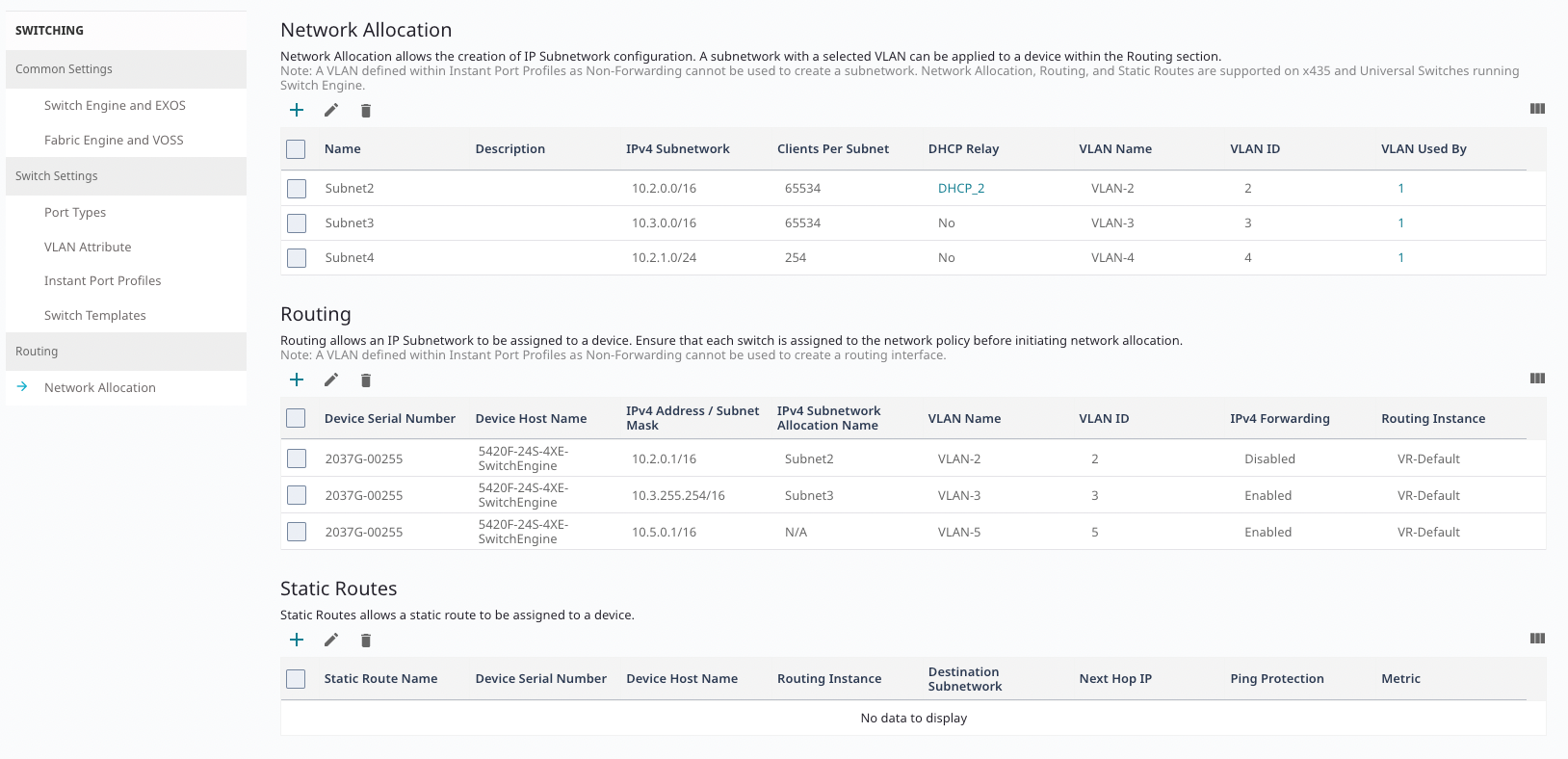 3. Select Switching > Routing > Network Allocation and scroll to the Routing table.