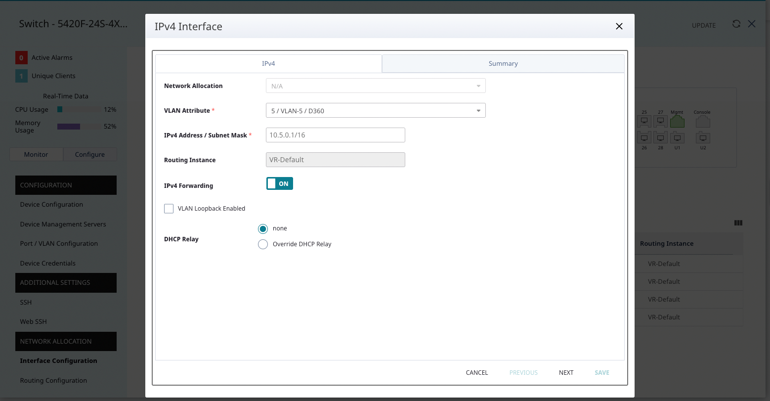 The VLAN defined within Management Interface Settings cannot be used to create a routing interface, an error message will be displayed when trying to create the IPv4 interface. If a VLAN used by an existing IPv4 interface is configured within Management Interface Settings, an error message will be displayed when checking delta or before pushing the configuration on the device.