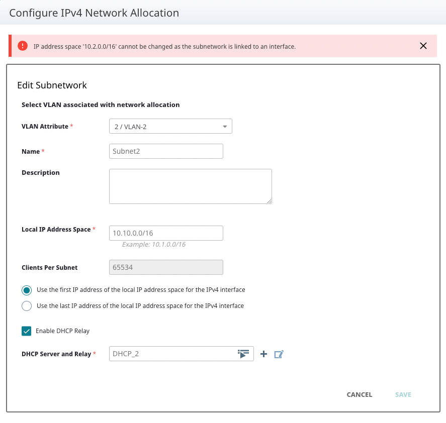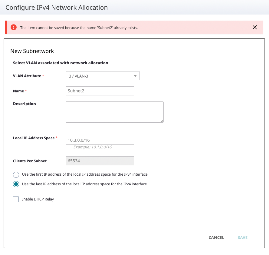 Note: You cannot assign a device to the same subnetwork twice or multiple subnetworks referencing the same VLAN ID or subnetworks with overlapping subnet space.