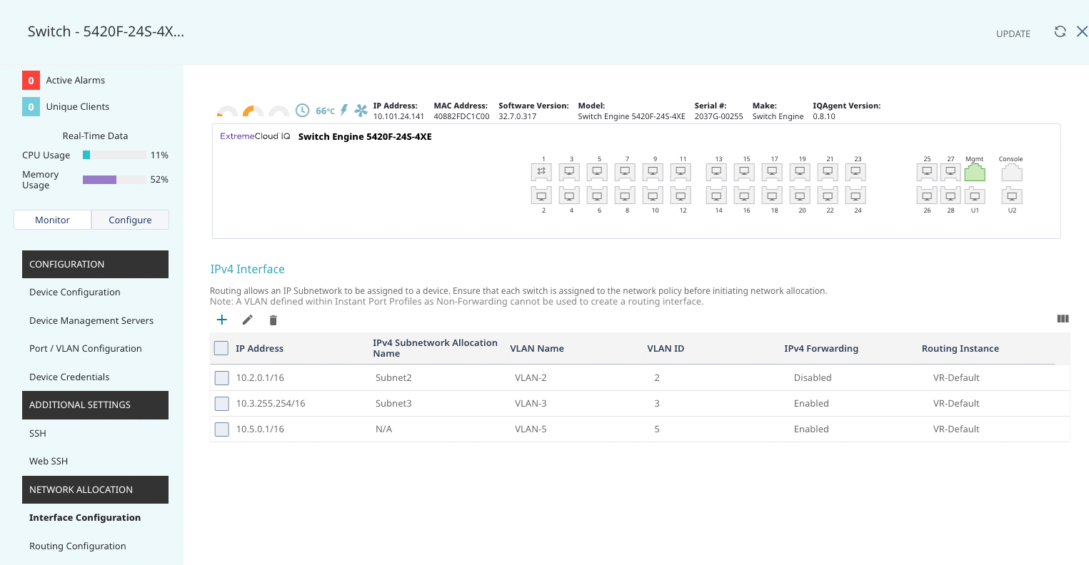 7. Device-level IPv4 interface configuration can be performed also from device-level page of each device which has a policy assigned: go to Manage > Devices and select the supported device. Select Configure > Network Allocation > Interface Configuration.