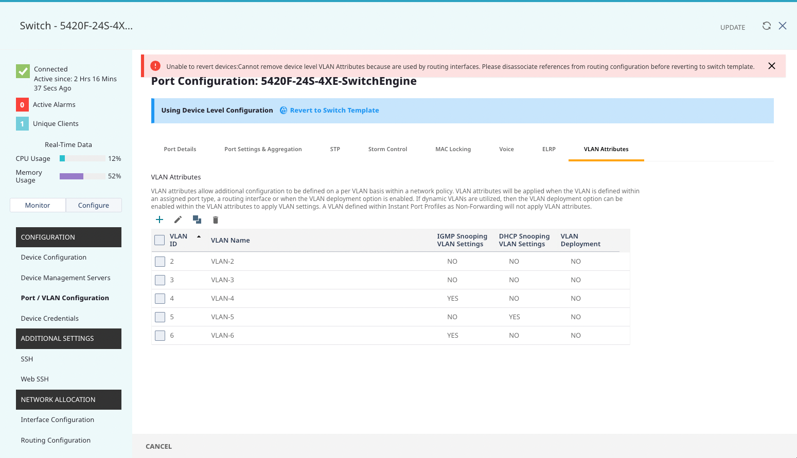 9. Before reverting Port / VLAN Configuration back to the switch template, ensure for all the VLAN IDs of the IPv4 interfaces created while the configuration was unlocked, there are corresponding VLAN attributes within the network policy or the operation won't be allowed.