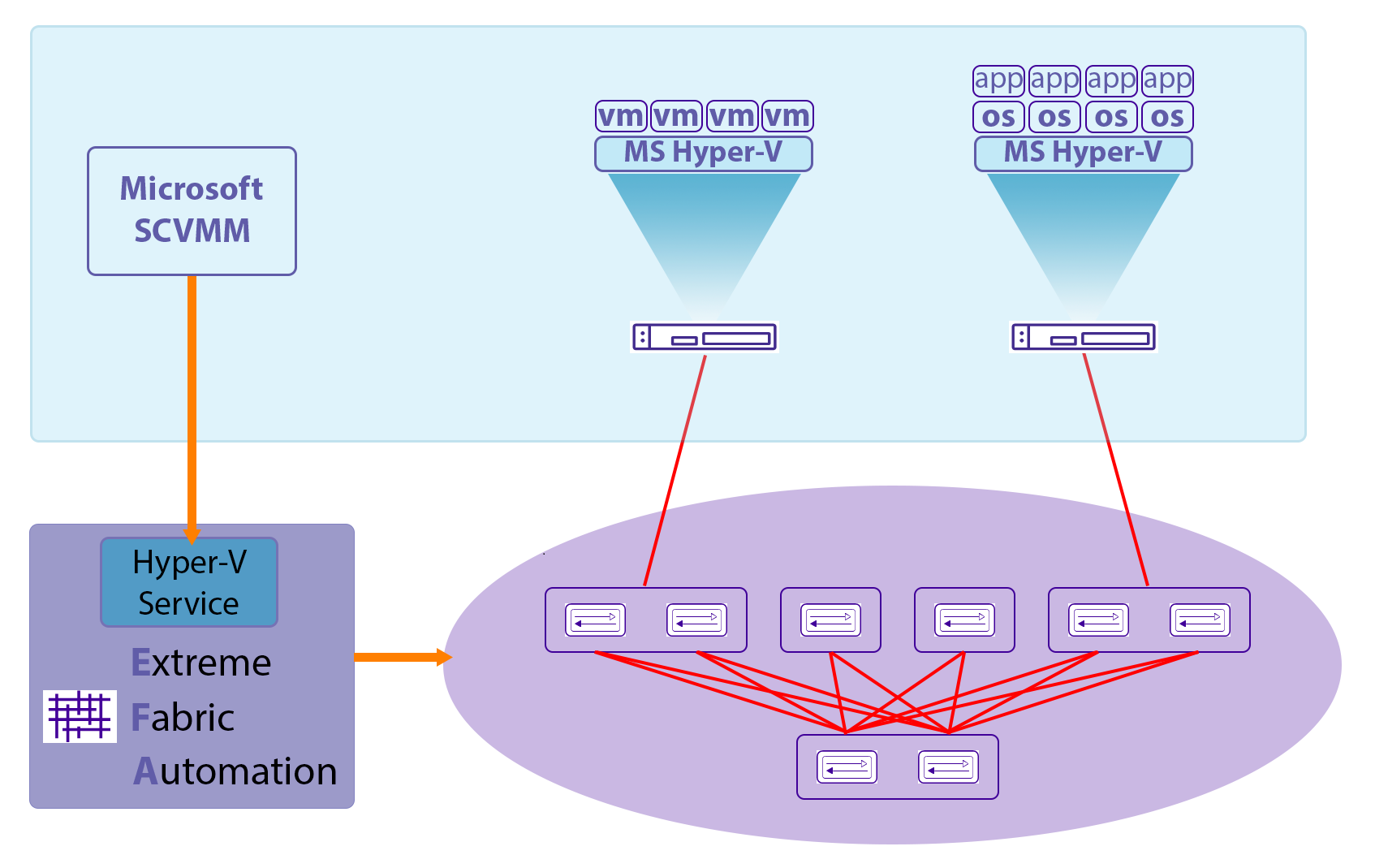 Use Extreme Networks' ExtremeCloud Orchestrator to automate the configuration of the datacenter's physical network hardware after configuring your Hyper-V servers and their associated virtual machines.