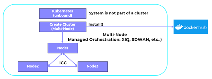Kubernetes components must be downloaded and installed during the cluster configuration stage. After you select ExtremeCloud Edge – Managed Orchestration as the cluster type and initialize the cluster, the appliance connects to Docker Hub to download additional Kubernetes components based on your installation requirements. The appliance installs the components and creates the cluster.