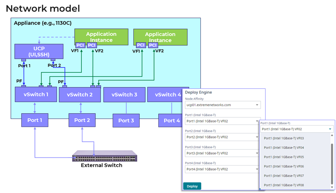 When you run multiple application instances on an appliance, the instances share the same port and switch, but the attachment point is different at the PCI level. The installed application instances attach to the vSwitch, but the applications see those attachment points as PCI interfaces that are mapped to a VF, and bound to a physical data port.