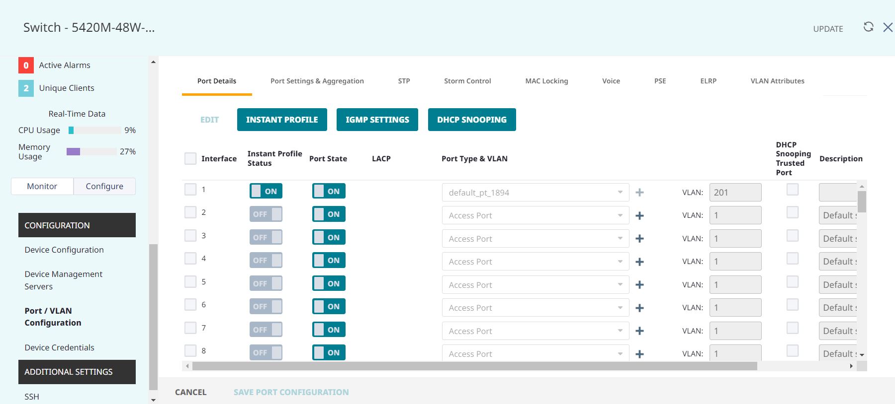 Snooping button and toggle the feature enabled within the Port/VLAN