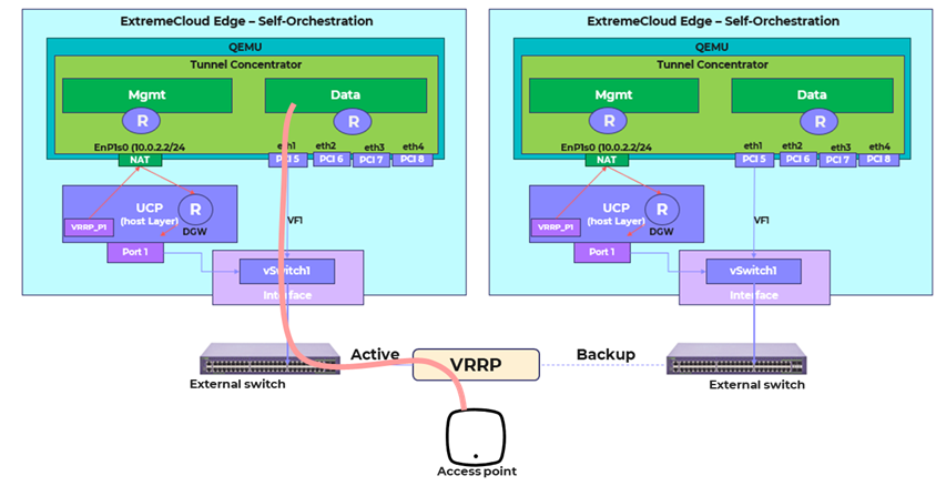 The following image provides an example of a flow between a wireless access point and a Tunnel Concentrator HA deployment that is managed by ExtremeCloud IQ. In this example, the two Tunnel Concentrators share a VRRP address that is configured from ExtremeCloud IQ for the Tunnel Concentrator service. Traffic fom the access point reaches the shared VRRP address and is redirected to the active Tunnel Concentrator in the HA pair. The traffic flows through the data ports into the Tunnel Concentrator data layer.