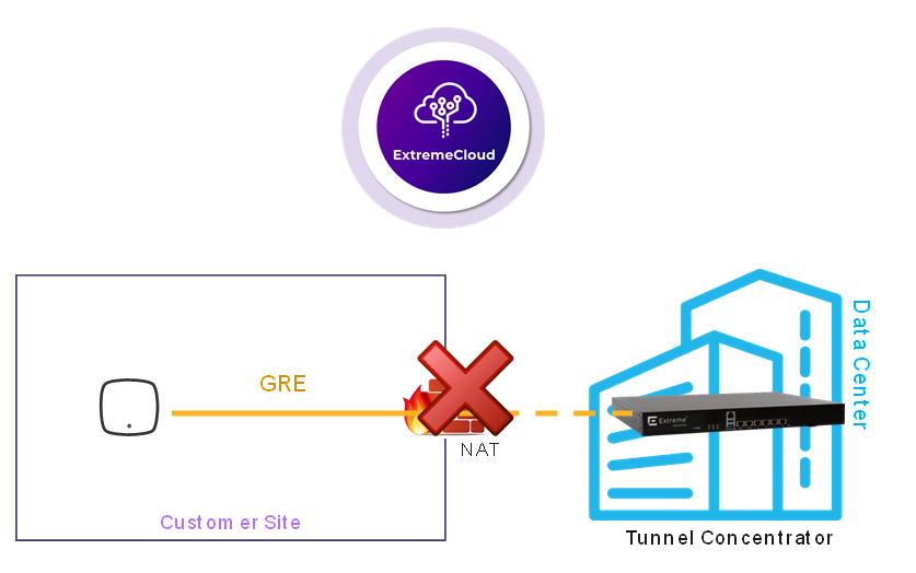 Tunnel Concentrator does not support the use of a NAT router between the access point and Tunnel Concentrator if the deployment is managed by ExtremeCloud IQ. Tunnel Concentrator must be on the same side of the firewall as the access point as illustrated in the following image.