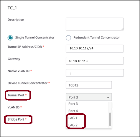 Tunnel Concentrator supports Link Aggregation (LAG) for the data ports. LAG interfaces increase link throughput and provide redundancy in case of a link failure.