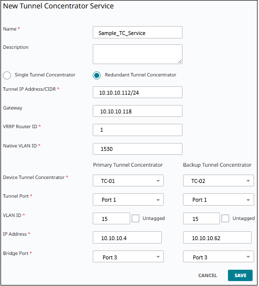 | Hostname | IP Address | Virtual IP on data port (uses VRRP) | Assigned Virtual IP Address | Tunnel IP Address (uses VRRP) | Redundant Tunnel Concentrators | IP Address (for tunnel termination) |