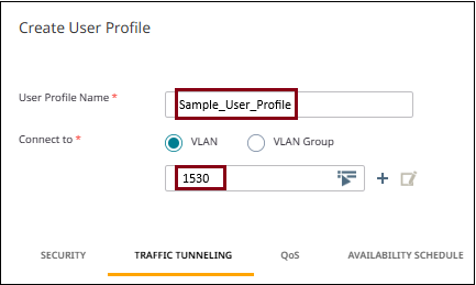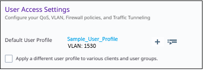 The new user profile with the Tunnel Concentrator settings displays as Default User Profile within the SSID configuration. The VLAN from the user profile is default VLAN for the SSID.