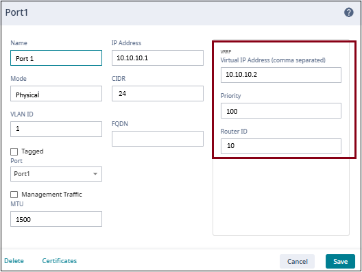 After the cluster is created, go to and configure VRRP on the data port that you configured using the wizard. Add the following VRRP settings to the existing port configuration: