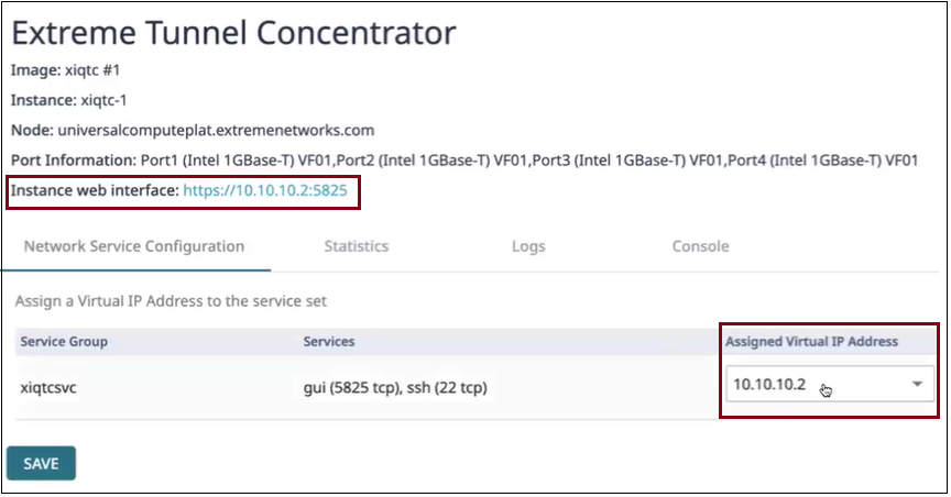 Select the Instance web interface link (https://10.10.10.2:5825) to launch the Tunnel Concentrator GUI at the login screen.
