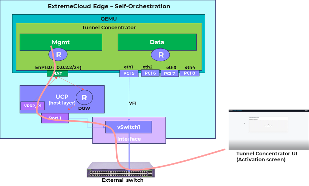 To access the Management User Interface on Tunnel Concentrator, a VRRP address must be configured on one of the data ports of the Universal Compute Platform. This VRRP address can be used as a mapped alias to the application interface, allowing access to the Tunnel Concentrator user interface using that address. User interface access is required during the initial installation process in order to read the instance Activation ID and apply the corresponding Activation license.