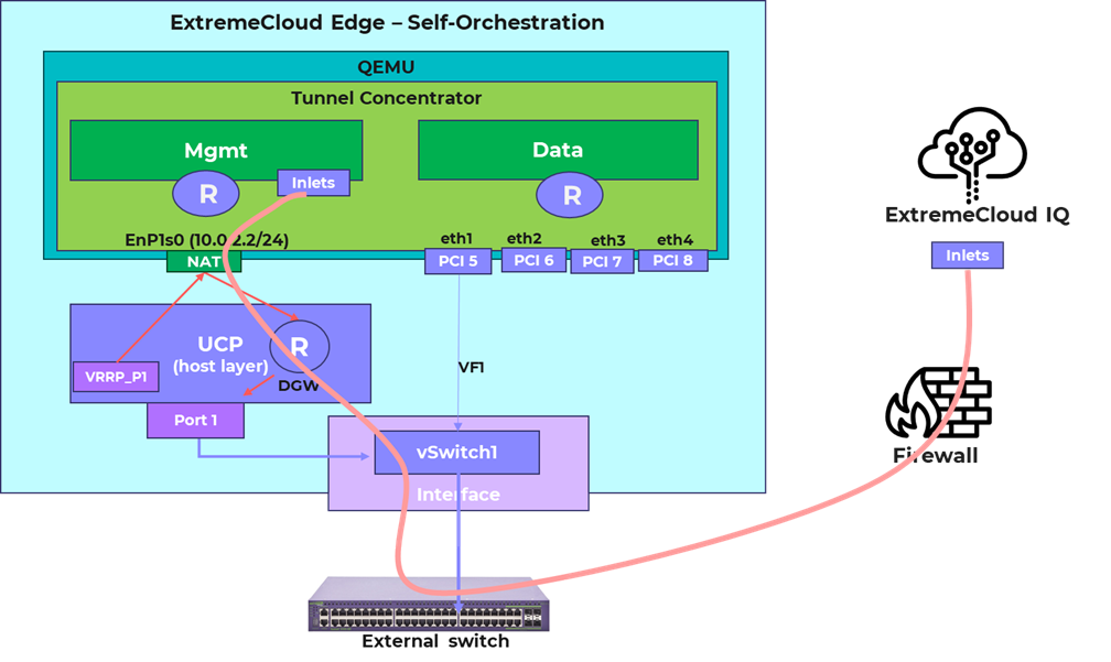 Traffic that originates from the host, for example Inlets connections to higher layer management frameworks such as ExtremeCloud IQ, crosses this application interface linkage to the host, which creates a direct dependency between accessing the Tunnel Concentrator instance and the routing settings on the underlying Universal Compute Platform host. Management traffic must flow through the Universal Compute Platform routing table to determine the path for network access.