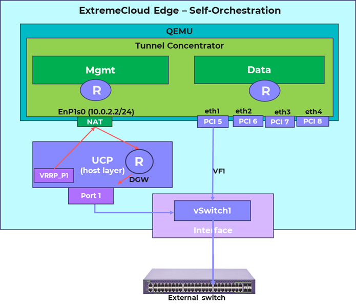 The following image provides a high-level of the two stacks for a Tunnel Concentrator instance, along with the internal connections and systems that allow Tunnel Concentrator to connect to an external devices, such as an external switch. The data layer can be accessed directly, but access to the management layer is hidden behind an internal NAT reference with access dependent on the underlying Universal Compute Platform routing table.