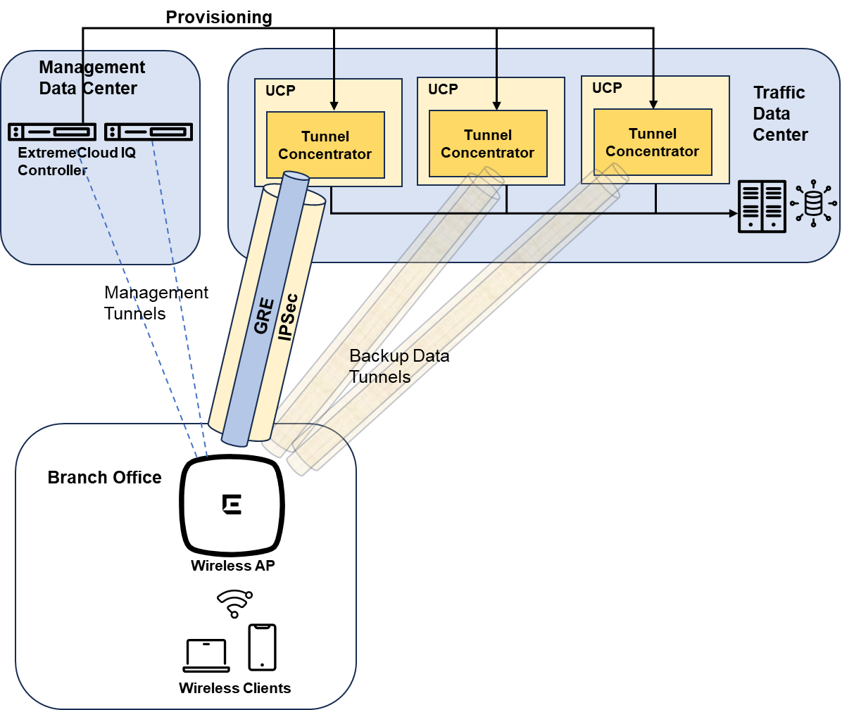 ExtremeCloud IQ Controller must be configured to allow an ICMP ping between the access point and the controller. The ping is required for tunnel failover to work.See the following illustration for a redundancy setup example that uses ExtremeCloud IQ Controller as the management application. This example uses three Tunnel Concentrator instances that are spread across three Universal Compute Platform boxes.