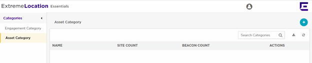 Select the Asset Category menu item from the list on the left of the screen. The Categories screen displays a list of all asset categories defined for your ExtremeLocation Essentials account.