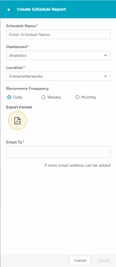 | Export Format | Export to PDF is the only format currently supported for scheduled reports. |