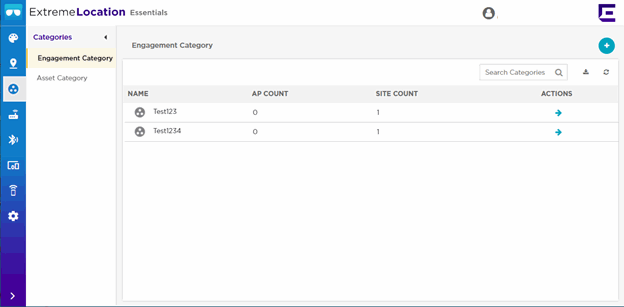 By default the Engagement Category screen displays. This screen displays a list of categories that you have defined for engaging with your visitors. ExtremeLocation Essentials also uses these categories for analysis of visitor flow when using Wi-Fi tracking.