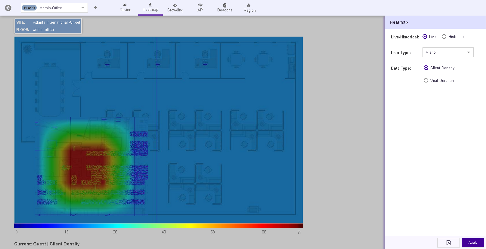 By default the Heatmap area displays live Client Density heatmap for visitors. The heatmap is color graded ranging from the color BLUE to the color RED where the color BLUE indicates no visitors and the color RED indicates maximum density of visitors. A scale is displayed below the heat map to indicate the number of visitors and the colors that represent these numbers.
