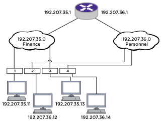 Routing Between VLANs shows an example switch configuration with two VLANs defined: Finance and Personnel. All ports on slots 1 and 3 are assigned to Finance, and all ports on slots 2 and 4 are assigned to Personnel. The figure shows the subnet address and interface address for each VLAN. Traffic within each VLAN is switched using the Ethernet MAC addresses. Traffic between the two VLANs is routed using the IP addresses.