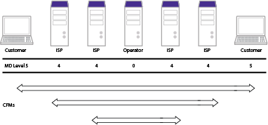 All CFM messages with a superior MD level (numerically higher) pass throughout domains with an inferior MD level (numerically lower). CFM messages with an inferior MD level are not forwarded to domains with a superior MD level. Refer to the following table for an illustration of domains with hierarchical MD levels.