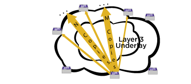 ExtremeXOS handles BUM traffic in VXLAN environments using head-end replication. Head-end replication means that each local tunnel end-point (LTEP) must replicate the frame and VXLAN encapsulate it for each remote tunnel end-point (RTEP) on the virtual network (VNI). The primary benefit of head-end replication is that it imposes no new restrictions or requirements on the underlay. All frames are unicast IP VXLAN frames, just like the normal/learned VXLAN frames. In Example Head-End Replication Topology, you can see for a given switch what the head-end replication looks for this VNI. In this case, the total copies sent by the ingress switch is N+M+3, all of which must traverse the uplinks from the ingress switch.