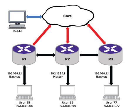 R1, R2, and R3 all advertise 192.168.1.0/24 to the core. This means that return traffic to the users will be sent from the core to any of these routers. A non-optimal path for the flows in either direction may result. Flows from User 55 to Core would traverse R1, R2. The return path could traverse R3, R2, and R1.