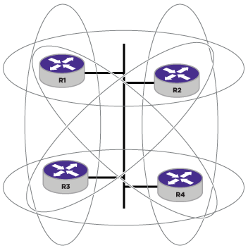 In this network, each of the ellipses represents a point-to-point adjacency. Each of the four routers periodically sends all of its LSPs to the other three routers. Each, in turn, will flood the received LSPs to the other two since they have no way of knowing which routers have already received them, generating N2 LSPs. This network routing traffic reduces the bandwidth available for data traffic. For networks that only have two routers and are not likely to grow, a point-to-point adjacency is appropriate.