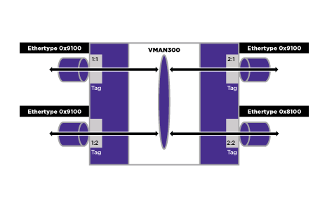# configure vman ethertype 0x9100 primary # configure vman ethertype 0x8100 secondary # # configure port 2:2 ethertype secondary # # create vman vman300 # configure vman vman300 tag 300 # # configure vman vman300 add port 1:1, 2:1, 2:2 tagged # configure vman vman300 add port 1:2 untagged