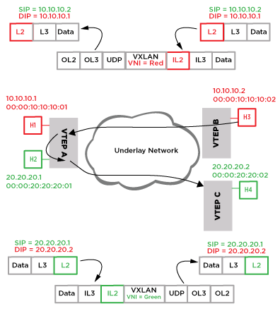 VTEPs acting as Layer 3 gateways would also have to support routing traffic that ingresses the VTEP on a VXLAN tunnel whose next hop is reachable through another tunnel. In Routing in and out of a Tunnel, H3 determines that the gateway to reach H4 is VTEP A. Traffic from H3 is VXLAN-encapsulated with VNI “Red” and Layer 2 forwarded to VTEP A by VTEP B. VTEP A decapsulates the traffic, performs a route lookup, and then determines that H4 is reachable through VTEP C. VTEP A now encapsulates the traffic with VNI “Green” and Layer2 forwards the traffic toward VTEP C.