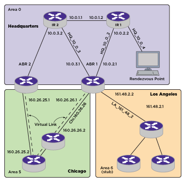 configure vlan HQ_10_0_2 ipaddress 10.0.2.1 255.255.255.0 configure vlan HQ_10_0_3 ipaddress 10.0.3.1 255.255.255.0 configure vlan LA_161_48_2 ipaddress 161.48.2.2 255.255.255.0 configure vlan CHI_160_26_26 ipaddress 160.26.26.1 255.255.255.0 configure ospf add vlan all area 0.0.0.0 enable ipforwarding enable ipmcforwarding configure pim add vlan all sparse tftp TFTP_SERV -g -r rp_list.pol configure pim crp HQ_10_0_3 rp_list 30 configure pim cbsr HQ_10_0_3 30