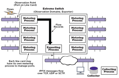 The Extreme Networks switch contains various metering processes that gather information about flows through different ports, or observation points, on the switch. This information includes: the ingress and egress interfaces, the link state, IPFIX state, flow count, byte count, packet count, flow record count and premature exports. The metering process then sends the information to the exporting process in the switch which handles communication, using TCP, UDP, or SCTP transport protocols, over the network to a collecting process.