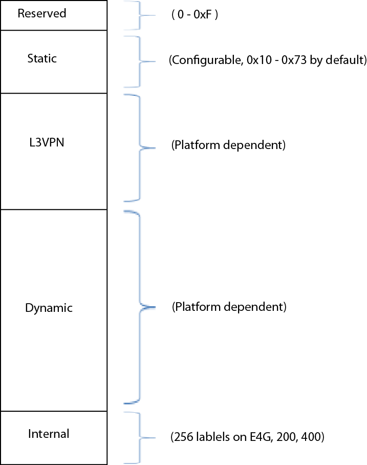 VRFs used for L3VPNs are allocated from a label range that immediately follows the static range. The remaining label space is called the dynamic label space, and is used by LDP and RSVP-TE. The show mpls label usage command displays the label ranges on a given system. The outgoing (MPLS ingress) label space spans the full 20-bit label range, and is used for all outgoing labels for both LSPs and PWs, static and signaled.
