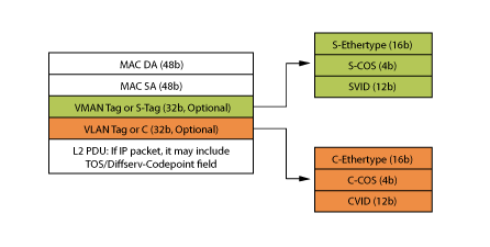 Each S-tag and C-tag contains an ethertype, a Class of Service (CoS), and a SVLAN ID (SVID) or CVLAN ID (CVID). The ethertype is described in Secondary Ethertype Support, and the CoS is described in QoS Support.