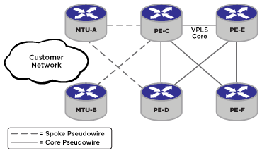 In the network shown in the above figure, only one of the pseudowires between the MTUs and their attaching PEs is active at any instant in time. This network provides fault tolerance for a failure at either MTU or at either of the attaching PEs, as well as for the active pseudowire in use between the MTUs and PEs.