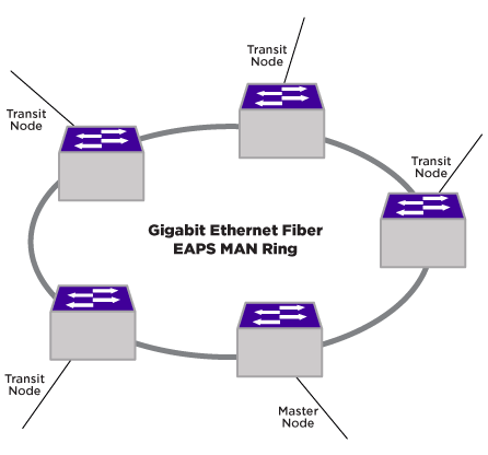 The EAPS protocol provides fast protection switching to Layer 2 switches interconnected in an Ethernet ring topology, such as a Metropolitan Area Network (MAN) or large campus (see Gigabit Ethernet Fiber EAPS MAN Ring).
