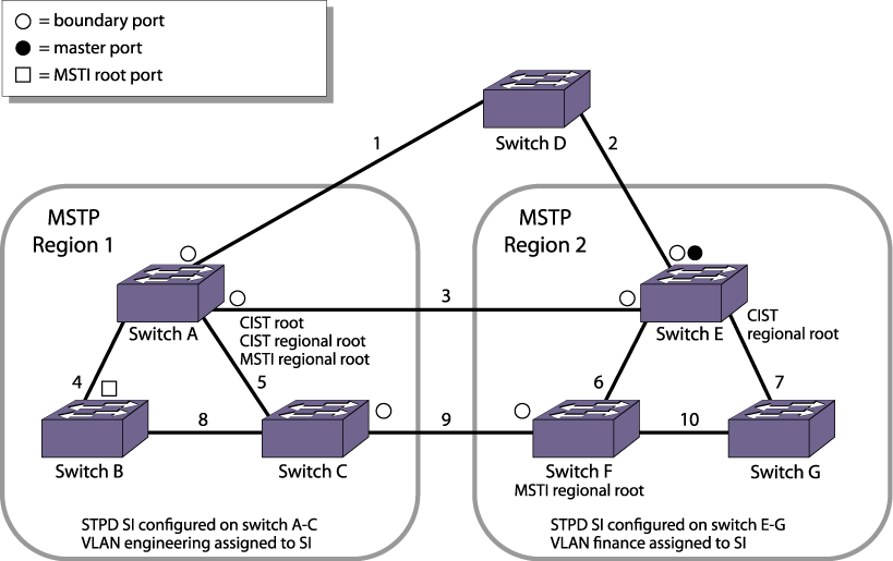 To further illustrate how MSTP operates and converges, MSTP Topology with the CIST Root Bridge Contained within a Region displays a network with two MSTP regions. Each region contains three MSTP bridges and one MSTI. The overall network topology also contains one CIST root bridge (Switch A, which has the lowest bridge ID), one interconnecting 802.1w bridge (Switch D), and 10 full duplex, point-to-point segments. VLAN Default spans all of the bridges and segments in the network, VLAN engineering is local to its respective region, and STPD S0 is configured as the CIST on all bridges.