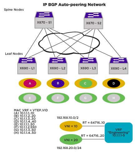 Consider an AutoBGP network that supports an “Engineering” VRF consisting of two subnetted VNIs for hosts A through H, and VRFs are created with VNI mappings, using policy or other means. A host is placed into a VLAN on an attachment port of a device which corresponds to a VNI. In order to support asymmetric routing, all virtual networks are created on all nodes even if are no local host IP/MACs are discovered. If there is no VLAN assigned to a VNI, one is chosen and assigned an internal tag. The VLAN is given a loopback designation. If a host is later discovered, that is associated with another VLAN with same the VNI, the new VLAN replaces it and will have no loopback designation. Here, A on L1 routes to H on L4 as A-H are on two different VNIs. There are no local hosts on VNI 20 on L1, in which case, the loopback designation for the internally chosen VLAN enables asymmetric routing to take place. L4 then bridges to H. Troubleshooting can be achieved by looking into the FDBs and ARP tables on each node.