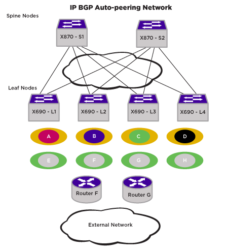 Consider hosts F and G that represent routers to external networks. Default static routes for hosts F and G are found as route entries in all nodes reachable on the local VLAN representing the VNI.