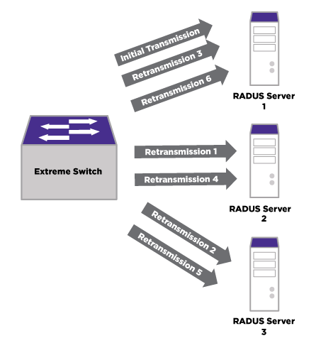 This figure shows the entire retransmission algorithm for a single RADIUS transaction if none of the servers were to respond. No more transmissions will occur for this transaction if a response is received by the RADIUS client software within the configurable timeout period.