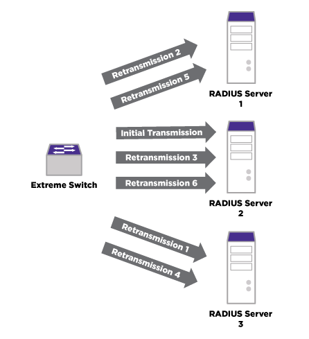 This figure shows the entire retransmission algorithm for a single RADIUS transaction if none of the servers were to respond. No more transmissions will occur for this transaction if a response is received by the RADIUS client software within the configurable timeout period. All servers are considered the same priority when using this transmission algorithm with each server taking its turn receiving the initial transmission.