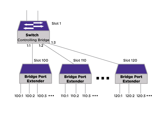 In VPEX mode, you refer to ports in the familiar slot:port notation in applicable commands, where the CB is always slot 1, and the BPEs are slots 100–162 (see Extended Bridge—Chassis Analogy).