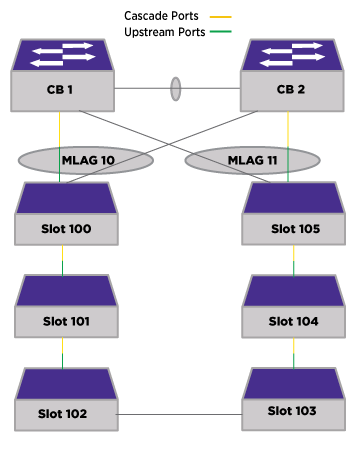 For dual (redundant) controlling bridges (CBs) on Extended Edge Switching rings, you can use cross-connect MLAGs. Cross-connect MLAGS require 48-port bridge port extenders (BPEs) with four trusted ports (for example, V400-48p-10GE4). Cross-Connect MLAG shows a ring formed using CBs connected to a BPE ring using two cross-connect MLAGs.