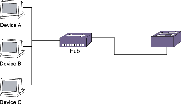 In Switch Configured for Limit Learning, three devices are connected through a hub to a single port on the Extreme Networks device.